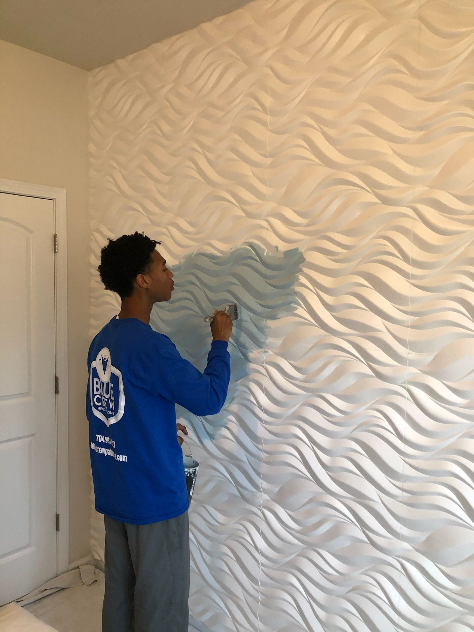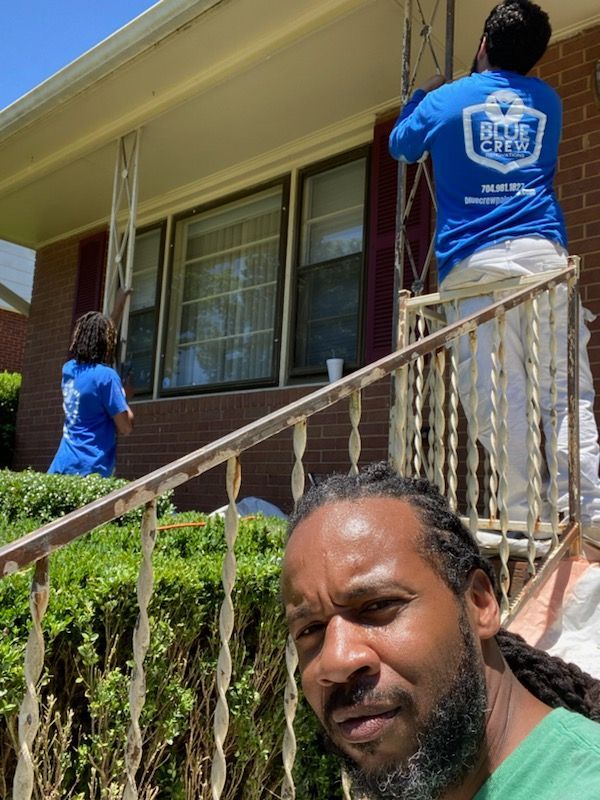 The Blue Crew is largely a family operation. Based in Charlotte, North Carolina, it's headed by El Bey along with his wife and sons: a few other crew members wield the brush as well. El Bey himself got his start in the trades in Michigan working for a roofer. The hours weren't enough to make do, and he moved into a painting job where he worked for a team of brothers. A few years later, in the late 1990s, he started his first paint company, all the while working through a union apprenticeship program and going to college for interior design. He also
